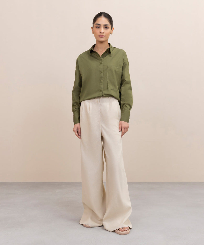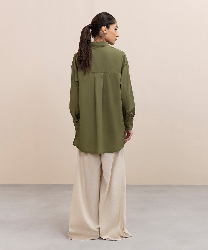 Loose fit button through shirt with collar and full sleeves. Patch pocket and dropped back hem. Details: Colour: Oli...